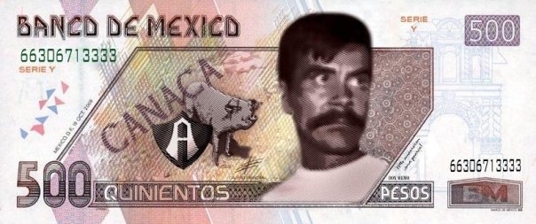 NOTA DEL PORTAL: Un supuesto billete con su imagen fue tan solo uno de los tantos montajes burlescos que circularon en Internet sobre “el Canaca”, un personaje mexicano que en el año 2007 fugazmente saltó del anonimato a la publicidad a raíz de una retención que había sufrido en el 2002, mientras se encontraba en estado de embriaguez, a manos de autoridades policiales a las que públicamente acusó de haberle robado su dinero dentro de la estación policial. En efecto, un video que había sido grabado en aquel 2002 vino a conocerse 5 años más tarde gracias a que fue puesto a circular en las redes sociales.